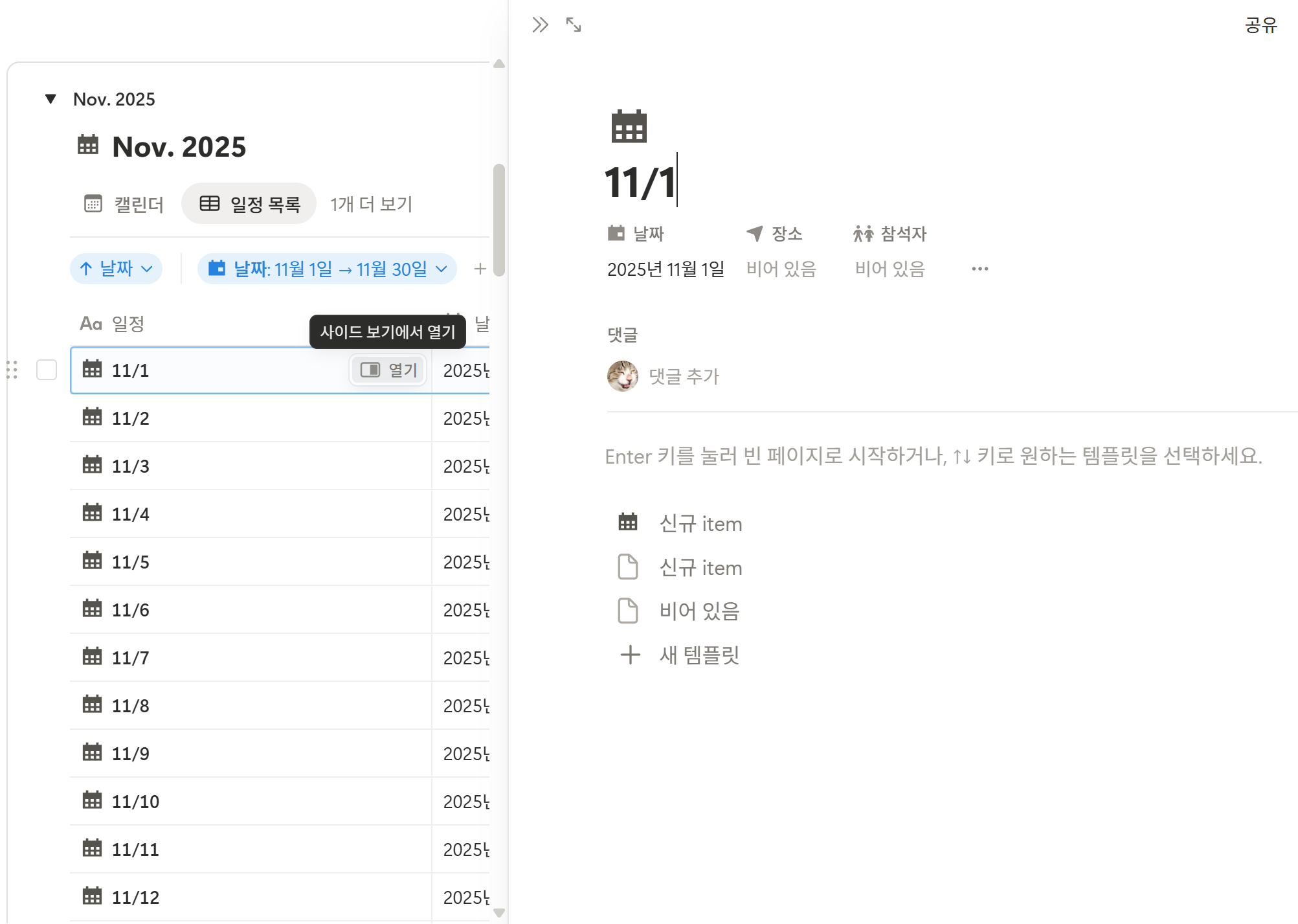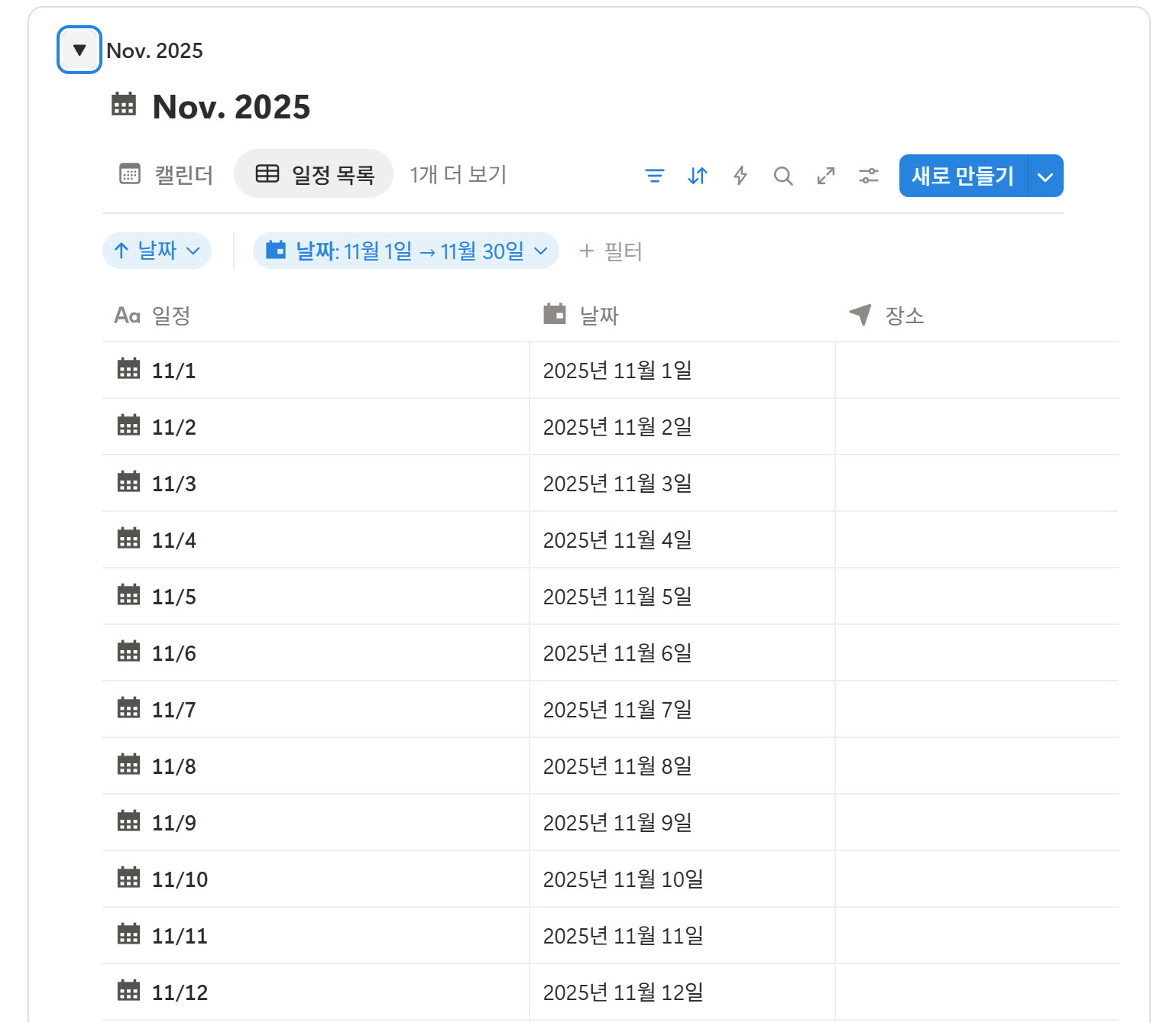 가운데에는 남은 11월과 12월 달력이 있습니다. 토글을 펼치면 11월 1일~ 12월31일까지 페이지들이 전부 나옵니다.