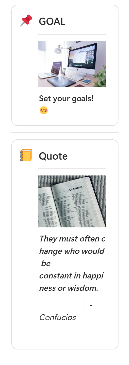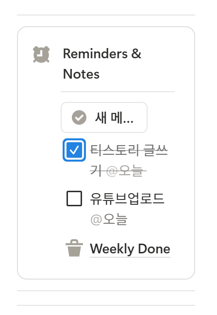 왼편 사이드바에는 매일 보는 다이어리이므로, 목표와 인용구를 넣을 수 있도록 하였습니다. 또한 리마인더 할일목록을 넣어, 한 눈에 보기 좋게끔 투두 리스트를 볼 수 있게끔 하였습니다.